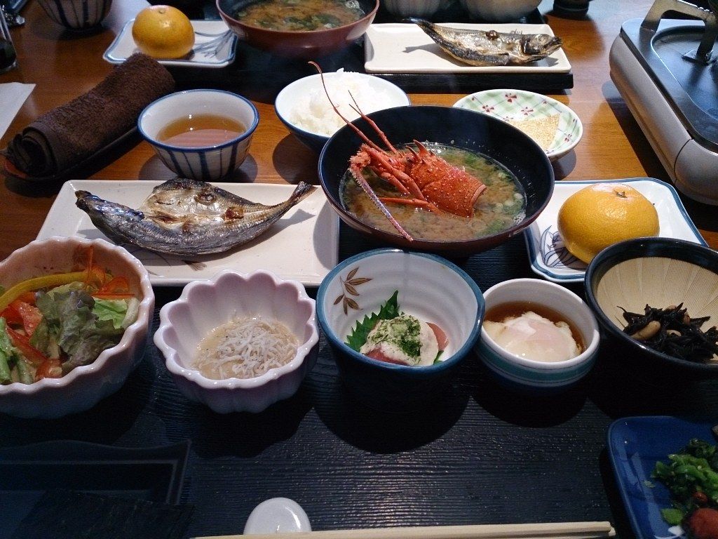 旅館の朝食、伊勢海老のお味噌汁も付いていて豪華ですね~